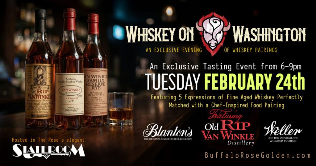 Please join us upstairs in the State Room at Buffalo Rose for a relaxing and informative evening where we creatively pair up some of the finest food in Colorado with the very best bourbons produced by the Buffalo Trace family of distilleries including Blanton’s, Van Winkle, and Weller. Buffalo Trace crafts some of the very finest Bourbon and Whiskey labels you have ever tasted!